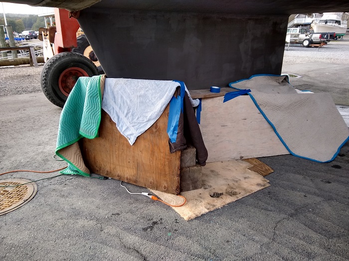 I won’t go into much detail except to say that I was able to clean things up beginning with a 5lb sledge hammer to bang down the high spots before filling things in with and apply some thickened West System epoxy. It was cold outside that day and I needed to get three coats applied, faired and then coated with bottom paint, all within 24 hours.