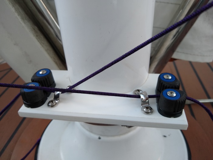 Each “jam cleat” is set up with a line that goes up from the bottom of the steering pedestal to one of the wheel spokes to hold things steady. It’s easy to pull the line out of the cleat and to secure things for minute adjustments. It will be interesting to see how it works. I’m optimistic.