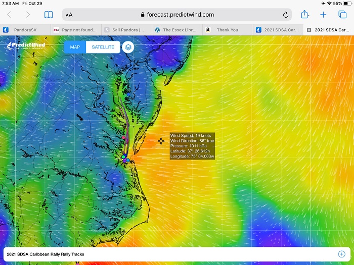 As of last evening, Chris Parker, our weather router, said that the “window” for departing Hampton will be Saturday and Sunday, a shorter window than he saw even one day before.