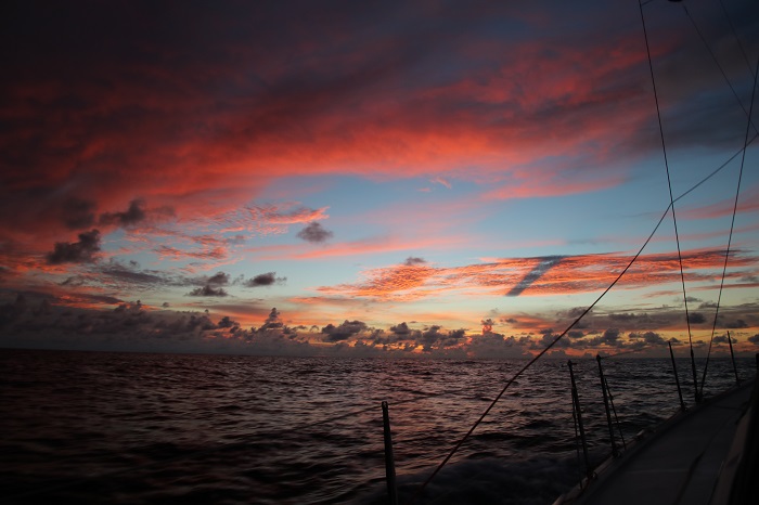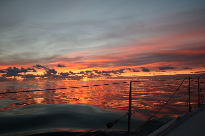 The three of us, George, Peter and me, divided up the “watch” at night in four hour increments. George and Peter swapped the 8-midnight and the midnight to 4 watches, every day or so, but I always took the 4-8 as that allowed me to enjoy my favorite moment, the sunrise, as the sun brightened the sky to the east. Sunsets are great too but nothing to rival the rise in the morning after a dark night. I have no idea what that stripe on the cloud was caused by but it struck me as particularly interesting.
