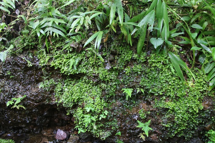 There is water dripping everywhere and all surfaces are completely covered with plants, small and large, competing to grow. Some are tiny mosses on wet walls.