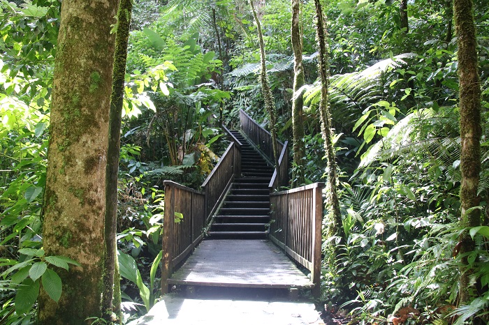 The walk to a spot where you can view the falls closer takes about an hour as a well maintained walkway meanders through the rainforest. There are a lot of steps, up and down both ways. Some are wood and others carved out of the rocks.