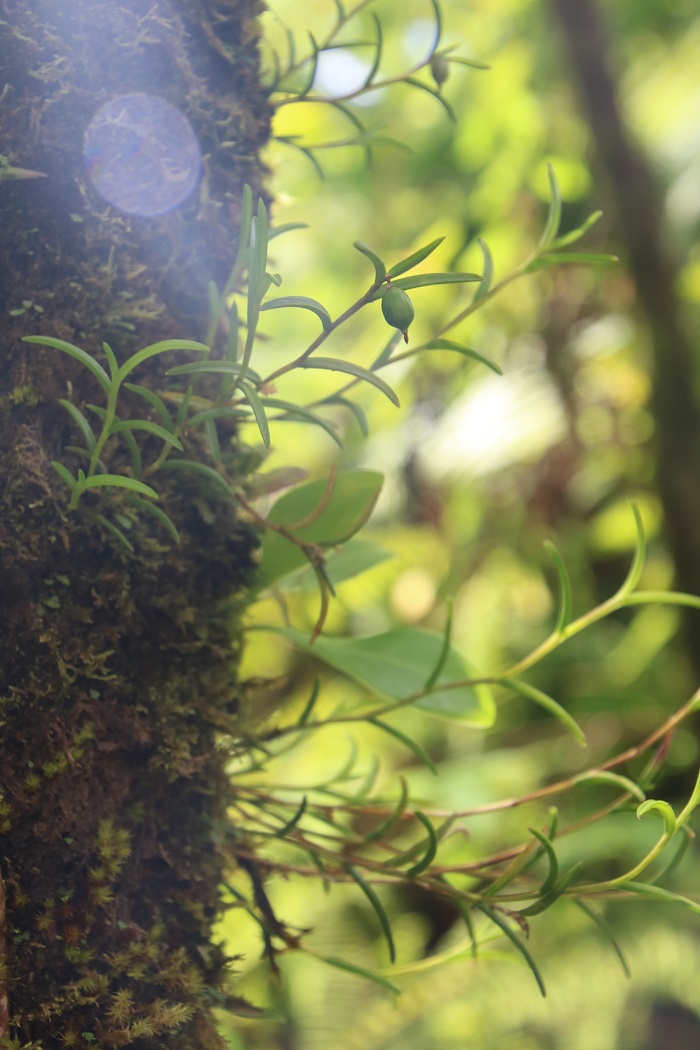 There are certainly orchids in the upper story of the huge trees but most are not in bloom this time of year. I did spy some delicate orchids, not currently flowering affixed to branches in the clearings, where sun could penetrate. In the dense forest, there isn’t enough light near the ground for most orchids to grow properly.