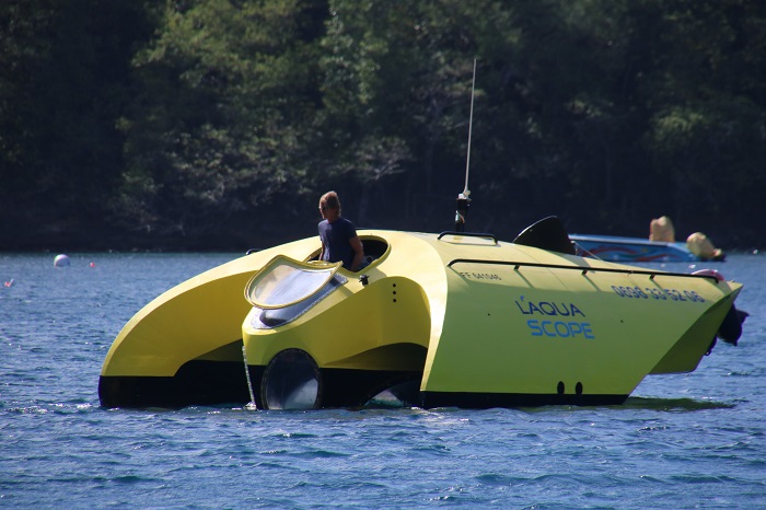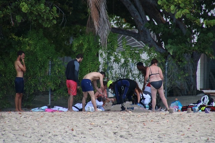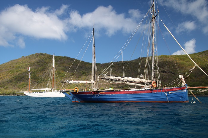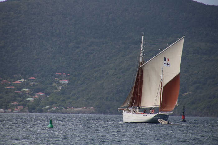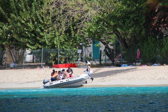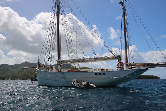 For those who don’t want to get their feet wet and still enjoy the turtles, this crazy looking boat makes it’s way slowly around the harbor multiple times a day.  I have no idea if this is a one-of-a-kind glass bottom boat it’s the only one we have seen.  It was in a nearby harbor in 2018 when we were last in the area.  I havent’ been able to find a reference online to this design or where they are made.   There are also a number of pretty amazing boats here, including two restored French fishing boats.  Biche, is the last surviving traditional tuna boat.  She was brought back from an abandoned hulk a number of years ago when she was restored in France.  She’s quite impressive with her unusual yawl rig.  We had seen her sailing in Les Saintes a few weeks ago.  She is accompanied by a smaller and not quite as well maintained cousin, on a nearby mooring. Of course, Pandora looks ok herself, framed by trees on the beach. There are a lot of folks snorkeling in the bay with dive boats heading out multiple times a day.  Some are heading far afield with others just bringing folks to nearby rocky beaches.  Yesterday, when I was talking photos of those two classics, I saw a group on the beach nearby, waving wildly to a dive boat and.  A short time later a rescue chopper appeared.  They hovered over the beach and dropped two EMTs while an inflatable launch ran up on the beach at high speed, delivering a patient.The chopper continued to circle around the area, kicking up sand and spray before landing in a nearby field.The took the stricken swimmer up under some trees and for what seemed like way too long, they worked aggressively to revive him with a series of techs applying CPR.Eventually, an ambulance arrived but there didn’t seem to be any urgency at that point to transport the patient to the hospital.  I am guessing that the outcome wasn’t good.