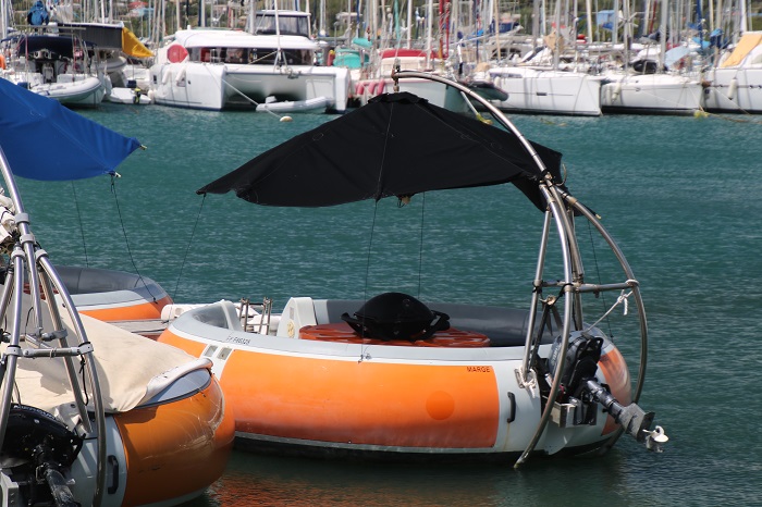 Don’t want to head out for a week long charter? Not to worry, you can charter a motorized floating barbecue for a few hours. We have seen these in the past but never out and about. In the wind, nearly 20kts today, I can’t imagine that these would be a whole lot of fun with the umbrella propelling you along in a way that makes the tiny outboard useless.