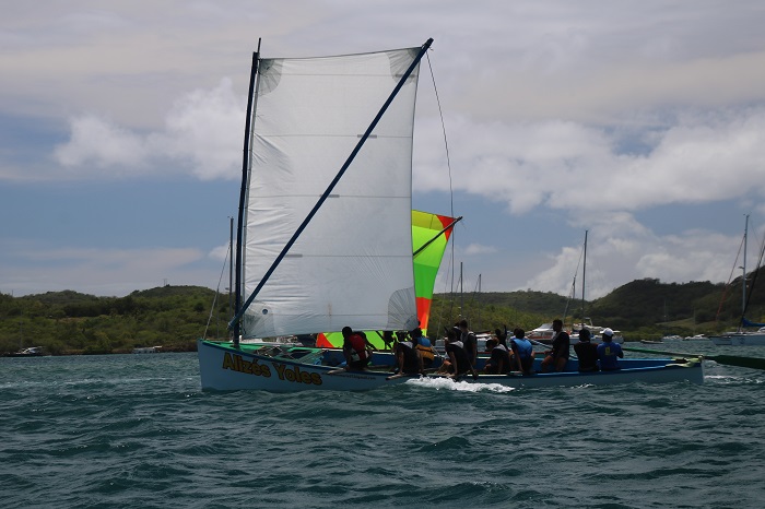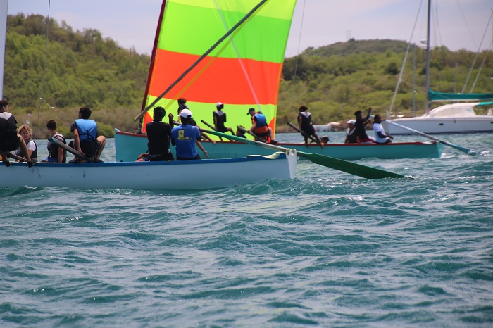On my way back in my dink from shopping and gassing up in La Marin, I passed these unique sailboats racing in the harbor. It seems that they are called Yoles boats and there is a very active racing fleet. These races draw thousands of spectators. Follow this link for a brief overview of their history. They have an interesting sprit rig. It looks like sailing them is pretty energetic with a large crew working hard to keep the boats upright.
