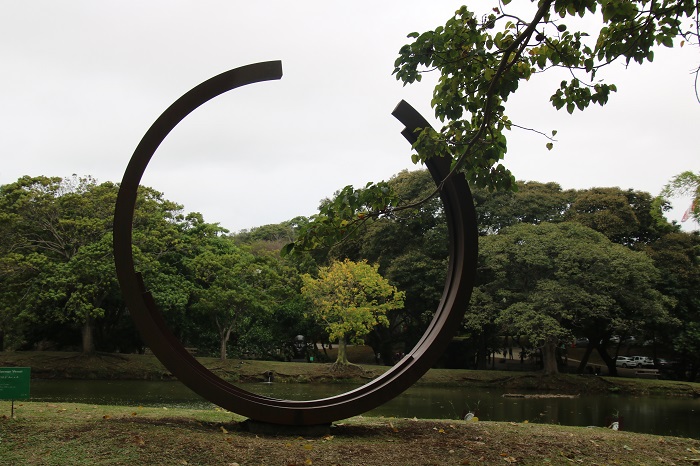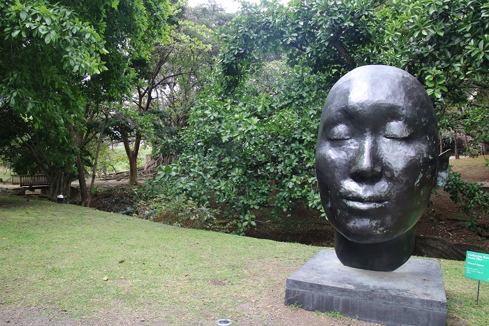 The sculptures that are placed on the grounds are quite large, like this 8′ tall mask beautifully sited on the edge of the pond.