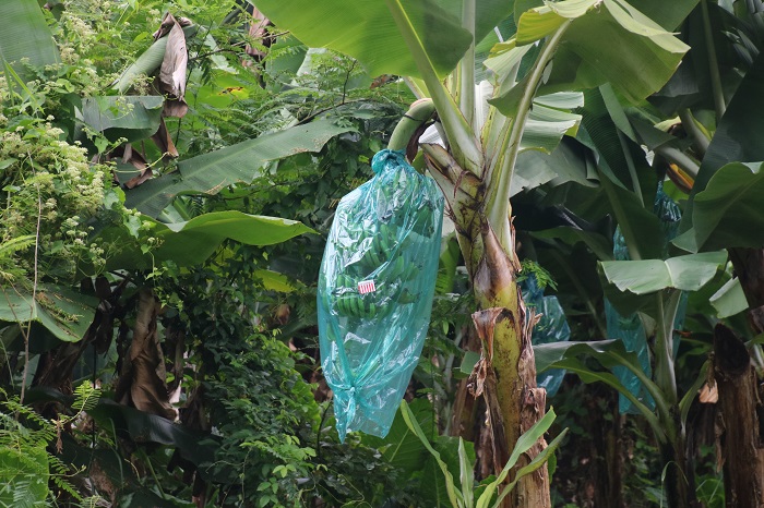 Each stalk is individually wrapped in a plastic bag to protect them from insects and to promote faster growth. When the fruit is ripe the part of the plant that bloomed dies and is replaced by a sucker that grows up from the bottom bulb.