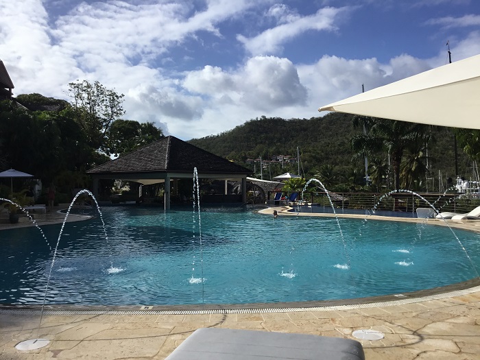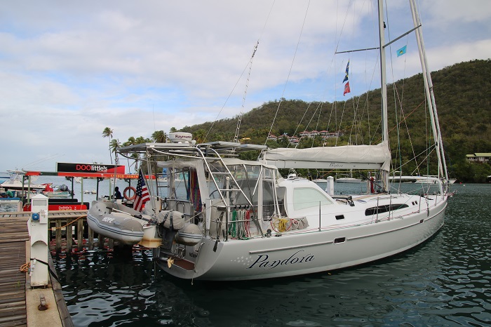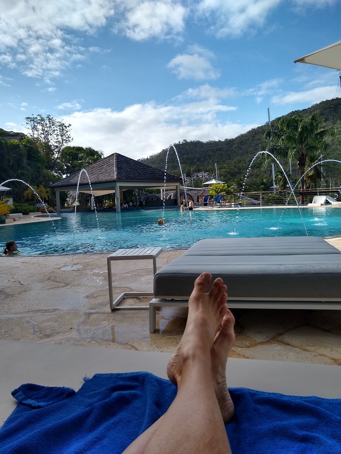 I like to begin a post with an image that is sort of reflective of what’s going on so here you go.  It’s been hard…chillin.We are spending about two weeks here at the Marigot Bay Resort, tied up at the dock, AC cranking away while we waste water with, sort of, long showers aboard.  Actually, compared to folks on shore, our normal water consumption aboard Pandora is about 15 gallons per day and now on the dock a whopping 30 gallons per day, I’d guess.