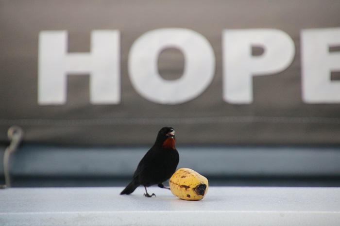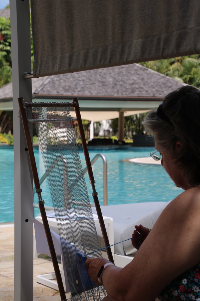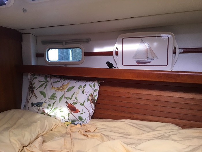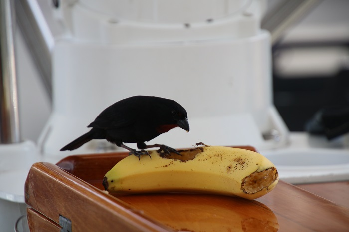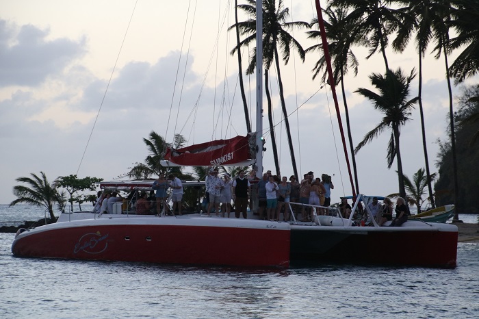 Anyway, it’s a nice cushy change of pace. The view from our cockpit is, well, tropical.And while we are spending about $70/day on the dock, the visitors in the hotel are paying about $500/night.   Such a deal! To be able to enjoy the pool while paying about the same cost as a mooring in Martha’s Vineyard is pretty appealing.   Brenda has actually been doing a bit of weaving poolside. Not a bad spot to spend an afternoon. We have met some really interesting folks here including the crew of a nearby mega yacht, a huge catamaran, the third largest in the world.  We have enjoyed some fun evenings aboard Pandora and their digs. How about a singalong?  Her cockpit is wider than Pandora is long.  Big frigging boat. Other “local color” includes a little bird that visits us most days for a snack of banana.  Brenda tells me he/she is a Lesser Antillean Bull Finch.Just to prove that the visitor is really aboard Pandora with our dink “HOPE” in the background, a sort of “proof of life” shot. No wait, this is even better.  He made himself at home in our cabin.  Brenda wasn’t happy about that.  Alas, gone pre-poop.   GO AWAY! This is just so BULLFINCH. The harbor is a very popular spot for party boats to tour.  They come in with music blaring and well lubricated passengers.  I wonder if they have enough life jackets aboard.  Hmm…In the interest of full reporting, chill though I may be, life aboard Pandora here isn’t without it’s mishaps.  The most recent “insult” was compliments of some sloppy docking by a 40′ Sunsail charter boat that tied up near us for one night.  He did a pretty good job of coming in but his inexperience showed when he left and clipped one of my stanchions with his grill.    Fortunately, the damage was limited to the single one.  I was able to bend it, sort of, back in place but it’s clear I’ll need to source a new one when I get home as the top is a full 2″ out of plumb.  And, it should be fun to find a part that was sourced in Finland in 2006 or so.
