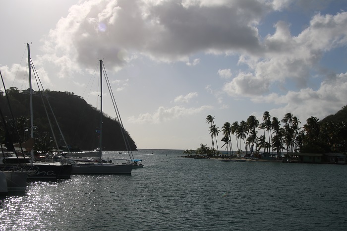 Well, after sending two weeks in Marigot, St Lucia, it was time to begin our run north to Antigua. It was a real treat to spend time at the lovely resort attached to the marina and to enjoy the views of Pandora with the ocean in the distance. I took this phot from the bow of Che, the huge cat that I have mentioned in past posts.