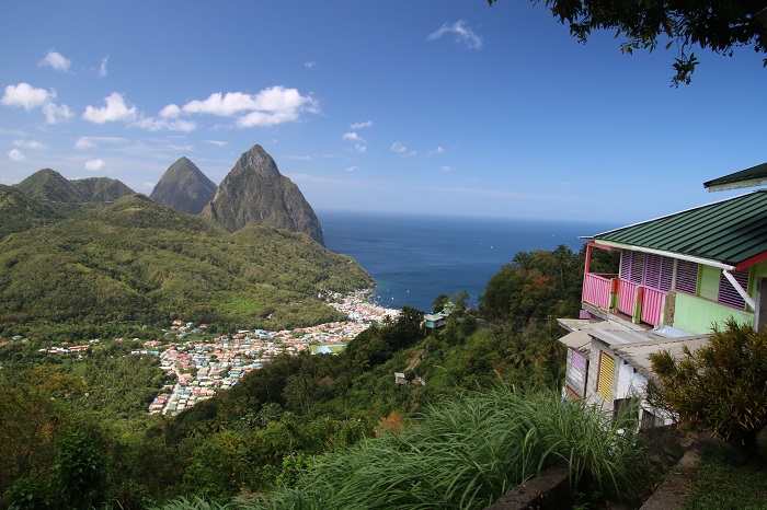 The island has been volcanically active for millions of years. In past millenniums, violently so as evidenced by the pitons, the cones of long extinct volcanos. These formations are all that is left after the softer outer parts of the structure weathered away and left the hard igneous rock. This view from an overlook along the winding, switchback road.