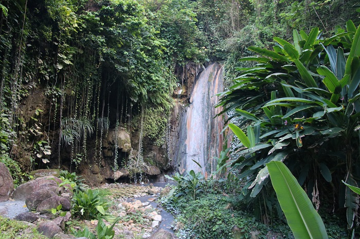 After lunch we visited one of the many beautiful waterfalls on the island. This one, diamond falls, is not far from the sulphur vents so the water spilling over the falls is warm and mineral laden. The water stained the rocks and was a dark grey. We were told that the color of the water changes day to day as the leaching of water from the vents evolves.