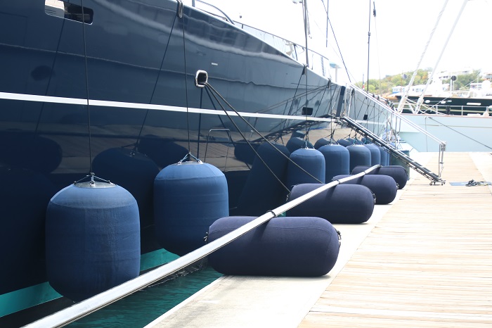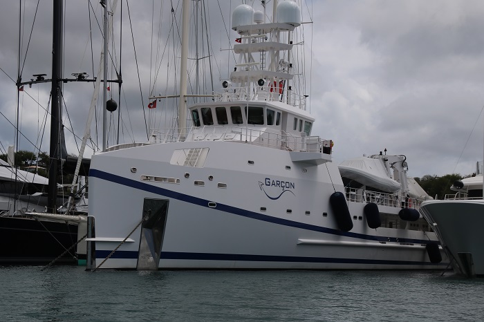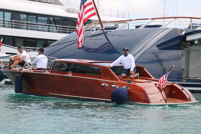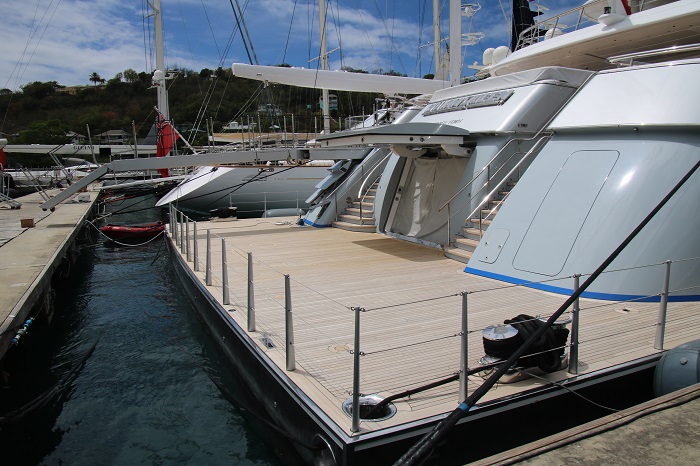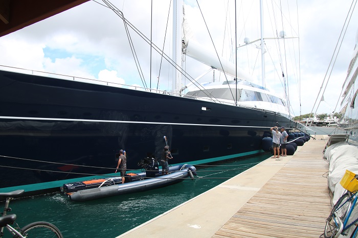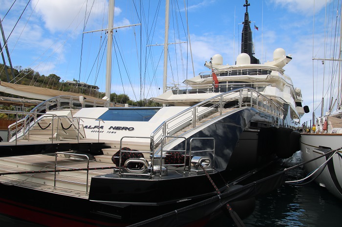 The schooner on the left is one that I have toured and written about in the past.  Her name is Mary Rose, the last schooner built by the great designer and yacht builder, Nat Herreshoff, known as the “wizard of Bristol”. The yachts that pack the marina are certainly not all classics and there are quite a few that are so huge that they dwarf even the biggest sailboats.    One of the largest is the Mayan Queen at 306′ long.  Her “beach club”, as the sunning area on the stern of yachts is referred to, gives a good feel for her scale.  Imagine how large the interior space is?It is fitting that this one is called Alpha Nero, as the is “alpha” in every way and no slouch at 270′.  She is reported to belong to a Russian.  Not surprisingly, nearly all of the yachts owned by Russians have fled the area as of weeks ago as sanctions have been levied on many of them in reprisal for the invasion of Ukraine.  An anchor and chain is a huge weight on a boat and one way to address this is to store your yacht’s anchor on a tender.  This boat is designed to carry the anchor for a maxi race boat.   They deploy the anchor and pass the chain to the “mother ship”.  And, they won’t have to wait long for the anchor to be delivered with over 1,000 hp.   Yup, another Russian owns this boat.  The boat that they tender is Scorpios, a 125′ racing yacht, one of the fastest in the world, launched in 2021.  Impressive graphics.And, speaking of tenders, how about Garson, a 21o’ long yacht designed to carry around “toys” that you don’t want cluttering up your “mother ship”.   I’ve seen her before. And, any yacht worth it’s station in life needs to have a proper tender.  This sort is referred to as a “limousine tender” for good reason. She belongs to Limitless, which is what your bank account would need to look like if you owned a yacht like this.   She is 315′ long, again, huge.   Her owner is Leslie Wexner, the founder of The Limited.  He acquired a number of other iconic brands including Abercrombie and Fitch and Victoria’s Secret.   Note the open area on the starboard quarter.  That is the “garage” for the tender pictured above. A huge amount of work goes into keeping a yacht in, well, “yachting trim”.  These guys were washing the side of a huge sailing yacht today.   This tender carries it’s own water supply, kept full from the dock by a large hose. I guess that by carrying their own water they can have an adequate supply even if the pressure from shore isn’t enough to spray high on the hull.  Why didn’t I think of that?And, with a large yacht, you need large fenders, and lots of them.  Notice the ones laying sideways on the dock.  A rigger is working on one of their forestays and roller furler that is really, really long.  Most of the yachts here have been built fairly recently but not this beauty, Talitha, 271′ long, built in 1930 for the founder of Packard Cars.   She is currently owned Mark Getty, the son of JP Getty.   Interestingly, Mark Getty founded Getty Images, a clearinghouse for professional photographs used worldwide. It is clear that Mark has fabulous taste.   Boy, would I love to get aboard her for a tour. Ok, one more photo of a sailing yacht that is a big contrast to all the ladies that are in town for the Classic Yacht Regatta.  She is the maxi racer named “Controlling The Animal, L4”, a mouthful of a name, launched in 2021.  She is one of the fastest racing yachts in the world and she really looks the part. It’s great to be back in Antigua again, where I made landfall back in November.  There is no shortage of magnificent yachts to look at, that’s for sure.