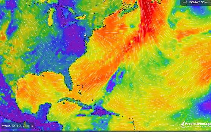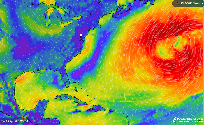 Fast forward a week and it’s still unpleasant with a major low heading east off of the coast. It is this sort of pattern that is the norm until things settle down in the late spring, think late May, early June. Sure, the wind direction NE of the Bahamas isn’t all that strong but it’s right out of the north. Not good at all for heading to the Chesapeake.
