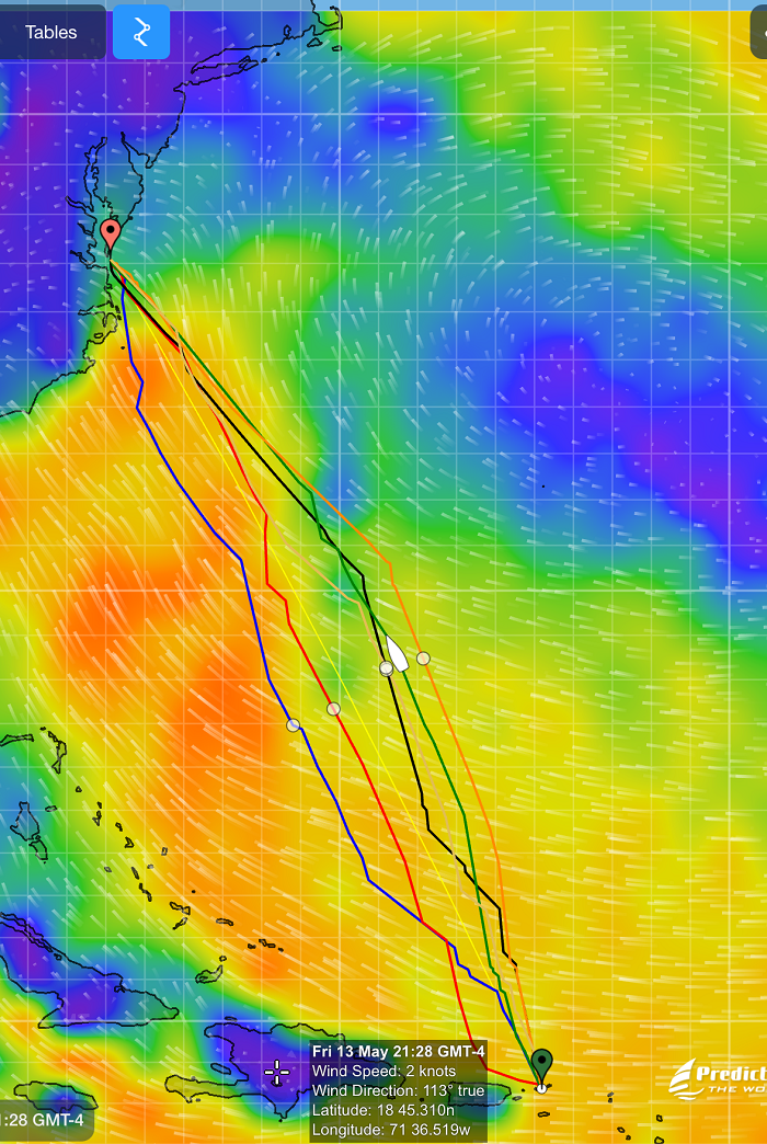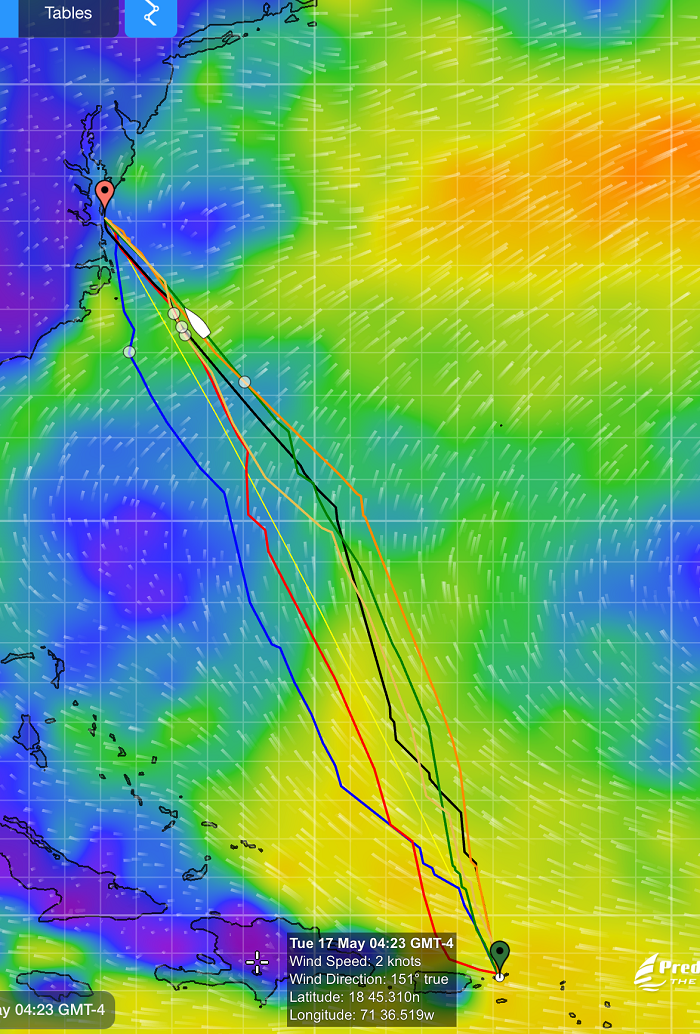 It’s a bit hard to see but the green areas are wind in the mid teens and we will be on a broad reach.  Not ideal, as I’d like a bit more wind when it’s behind us, but pretty good.  As we make our way north, conditions continue to be good with favorable winds, and you can see that the nasty low has moved out of the area.  We will continue to have wind aft of the beam, and hopefully it will be strong enough to keep us moving at a good speed. Finally, as we approach the US east coast, there is a bit of uncertainty with a weak low forecasted to exit the coast.  Again, Chris feels a high degree of confidence that it will not amount to much.   Fingers crossed that it will be long gone by the time we cross the gulf stream off of Cape Hatteras and arrive at the mouth of the Chesapeake Bay. All and all, it looks like the wind will be favorable for the entire trip if perhaps a bit light at times.  Light wind isn’t a huge problem as I have plenty of fuel, so bring it on.