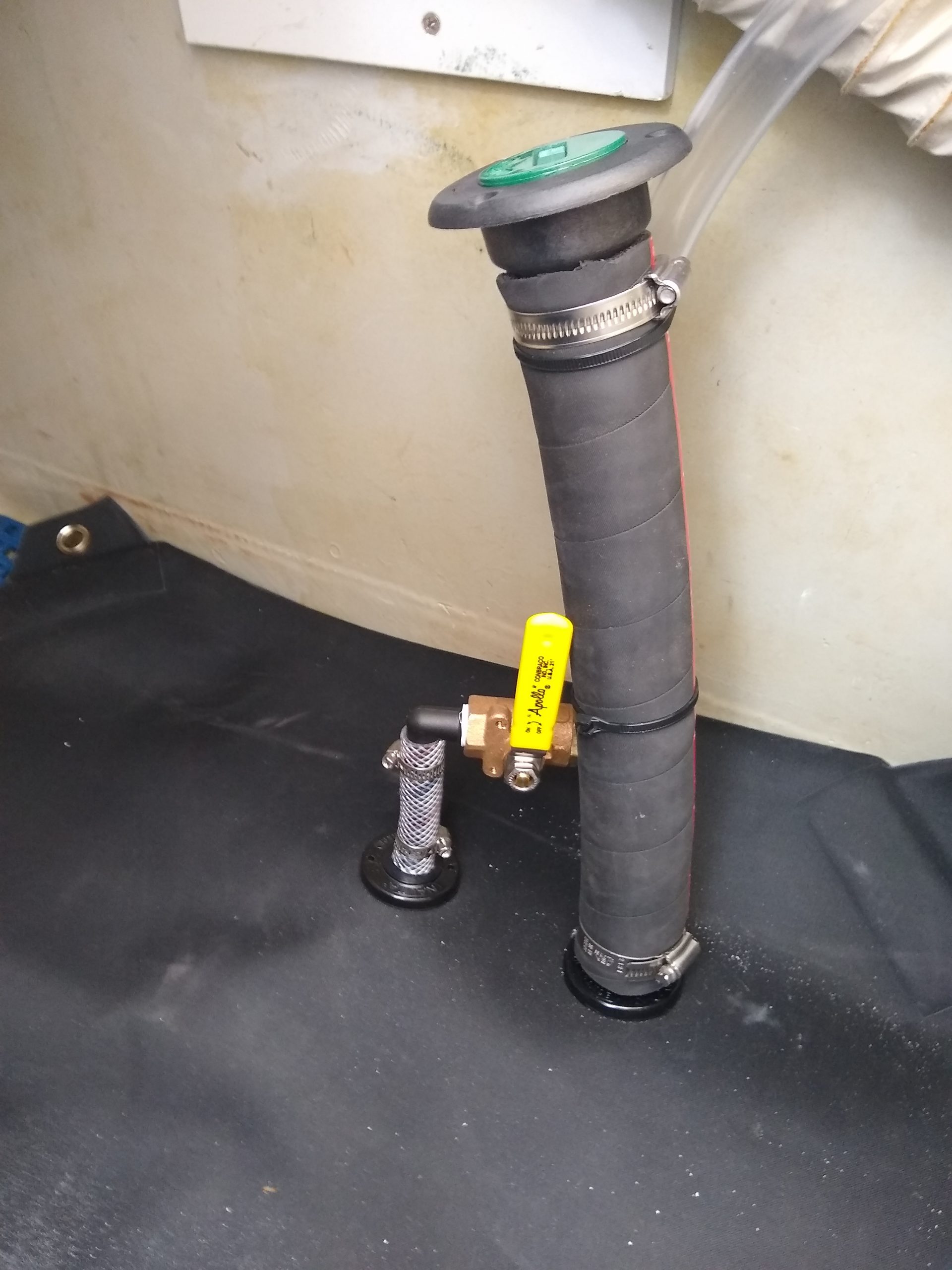 Unfortunately, I didn’t take a photo of the filled bladder in place. I did have some difficulty in filling the bladder with fuel as when the diesel foamed, which it always does, a large “bubble” accumulated in the highest part of the middle of the bladder. I had some difficulty “burping” out that air. The foam made the bladder look full even though it was nowhere near capacity. I was able to get some of that air out by pulling up on the fill hose. However, that proved to be messy as when the air was released through the fill tube, diesel splattered all over the place. The solution will be to put a vent tube in the highest part of the bladder that I can open up with a valve to bleed off the captured air. There is already a screw fitting in place that I can adapt.