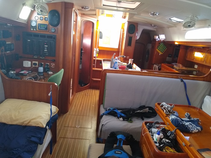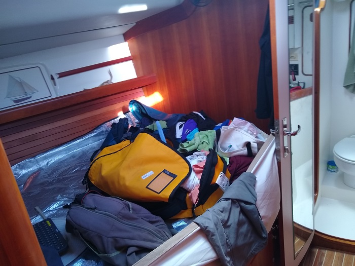 While I’m on the subject, on passage, we store all of our gear up in the forward cabin, complete with lee cloth to keep everything in place.