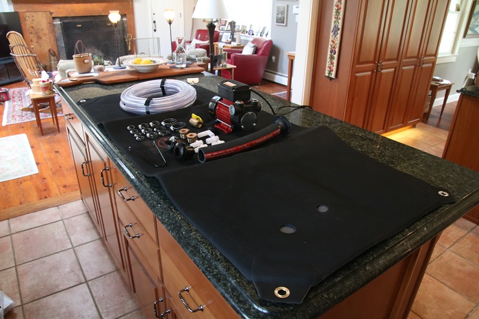 Here are the components of the bladder assembly as I prepared the system to take to Antigua and Pandora. The bladder itself is over 5′ long.