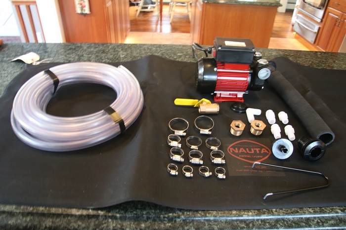 Beyond working out how to configure the full system, it was particularly difficult to source the fuel transfer pump. After a lot of looking, here’s what I came up with. There are battery powered versions too but I was concerned about the battery loosing it’s charge as it would be used so infrequently. The roll of tubing is to run from the pump to the forward fill ports for each fuel tank.