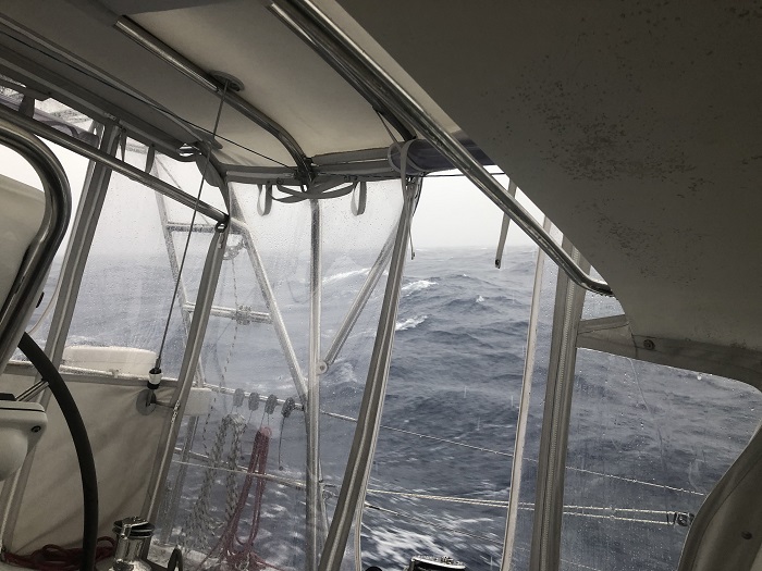 At speed, Pandora is a wet boat and we are taking plenty of water over the bow with beam seas in the 10’ range. Occasionally, we ship a good amount of water, especially when her fine bow plows into the back of a particularly large wave, but with her generous hard dodger and full cockpit enclosure we stay fairly dry, save for occasional water that washes across the back of the cockpit after sluicing under the enclosure panels.