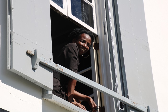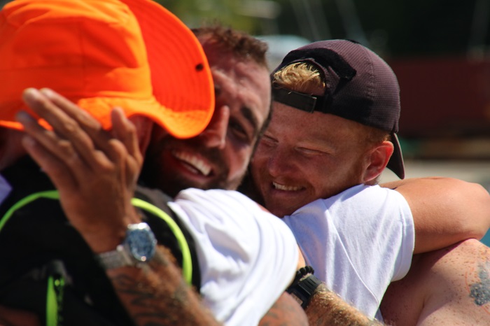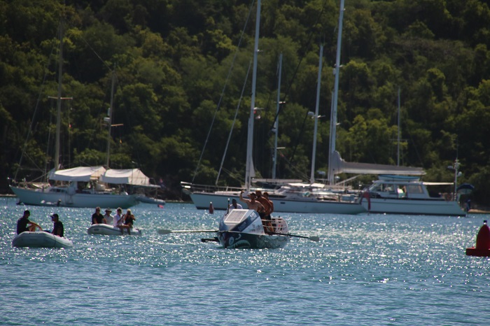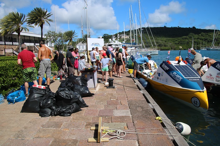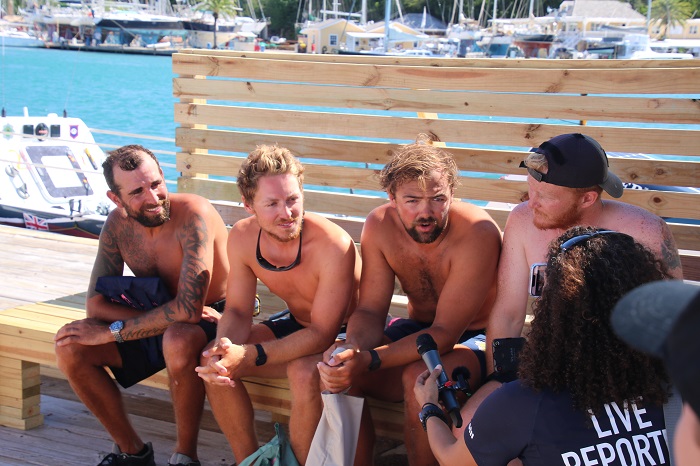Like the boats in the Salty Dawg Rally, each boat in the race has a tracker on board so that folks on shore can follow along.   This is a screen shot of the fleet.  A few days ago I decided to go over to English Harbor to welcome one of the boats that was arriving.  There were hundreds on hand to welcome the crew including perhaps 20 or so that were wearing matching shirts.  It was fun to see the boat as they entered the harbor, serenaded by the horns of the big yachts and accompanied by a number of dinks that were happy to greet them too. These guys, all members of the Scots Guard or military, were clearly pretty excited to be nearing land.  I was told that one of them played the bagpipe but I didn’t see or hear that.  Ashore was all done up with banners and such. While I was standing around waiting for the boat to appear, I heard someone call my name.  It was Ann-Marie Martin leaning out of her office window, obviously also excited about the arrival of the boat.  She’s the Park’s Commissioner who I have come to know over the years of bringing the SDSA fleet to Antigua.  As each of the crew stepped ashore, after more than a month at sea, emotions ran high.  It was moving to see them greeted by family after so long apart. There was plenty of enthusiasm for the UK and Scotland in evidence. Next on the agenda was a sit down interview and when that was over, a meal of cheeseburgers and beer.  I’ll bet that it was a welcome change from oatmeal and freeze dried food.  Their accomplishment was really something, rowing across the Atlantic but it didn’t take long for them to announce that “the Atlantic Guardsman were formally retiring from ocean rowing”.  That makes sense to me.  For them, been there, done that.  If you’re curious about this team and want to learn more, follow this link.