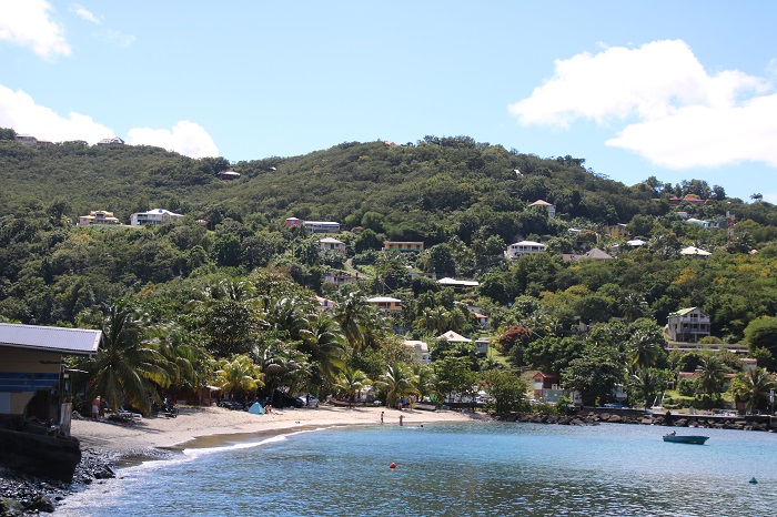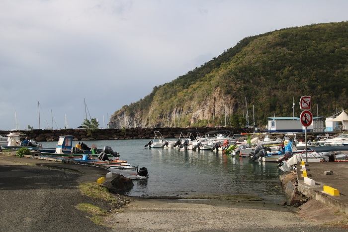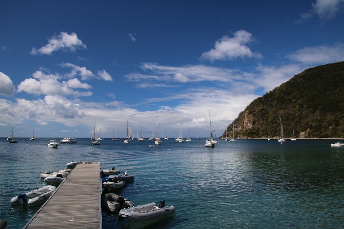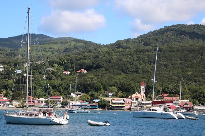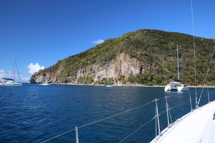 Deshais is a charming little French village on the NW end of Guadeloupe. The harbor, more of an indent in the island actually, is very tiny and the bottom drops off rather fast as you get a few hundred yards from shore. To port is an impossibly steep cliff.