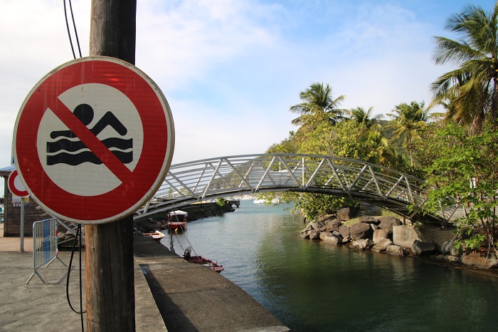 To the side is another wall that lines the river that feeds into the harbor. It’s more of a stream actually. When the surge in the harbor is too big and they have to dismantle the top of the dock, you can bring your dink up here into calm waters. This sign says “no swimming!” See, I can speak French after vall.