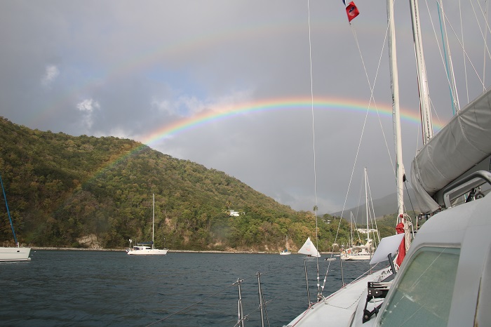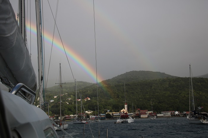 We made the 45 mile crossing to Guadeloupe in sporty conditions from Antigua yesterday, where Pandora had been since we arrived in mid November. Along the way we were hit by a squall with near 30kt winds. Brenda was not amused.