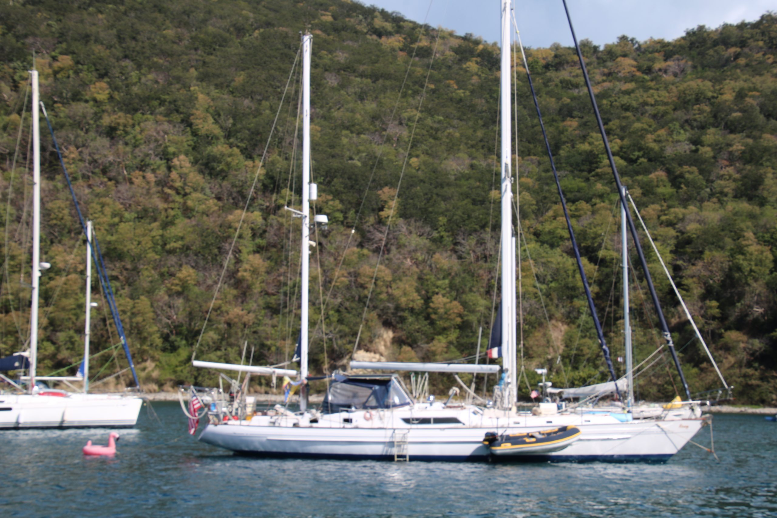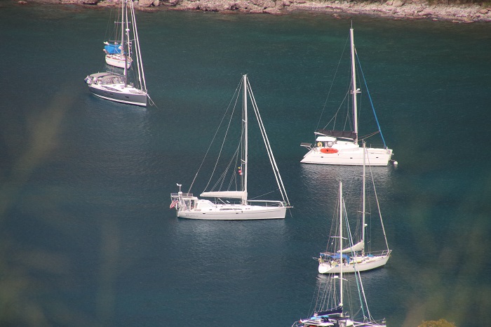 We have been buddy boating with our friends Lynn and Mark on Roxy since Antigua as we have been for the last few years.  It’s fun to go from harbor to harbor with folks we know.  Here’s Roxy.  She’s a huge 60′ ketch and very heavy at 80,000 lbs.  By comparison, Pandora weights in at about 32,000 lbs. fully loaded.  Yesterday I went on a hike with Mark and the girls met us at a nearby beach for a late lunch.