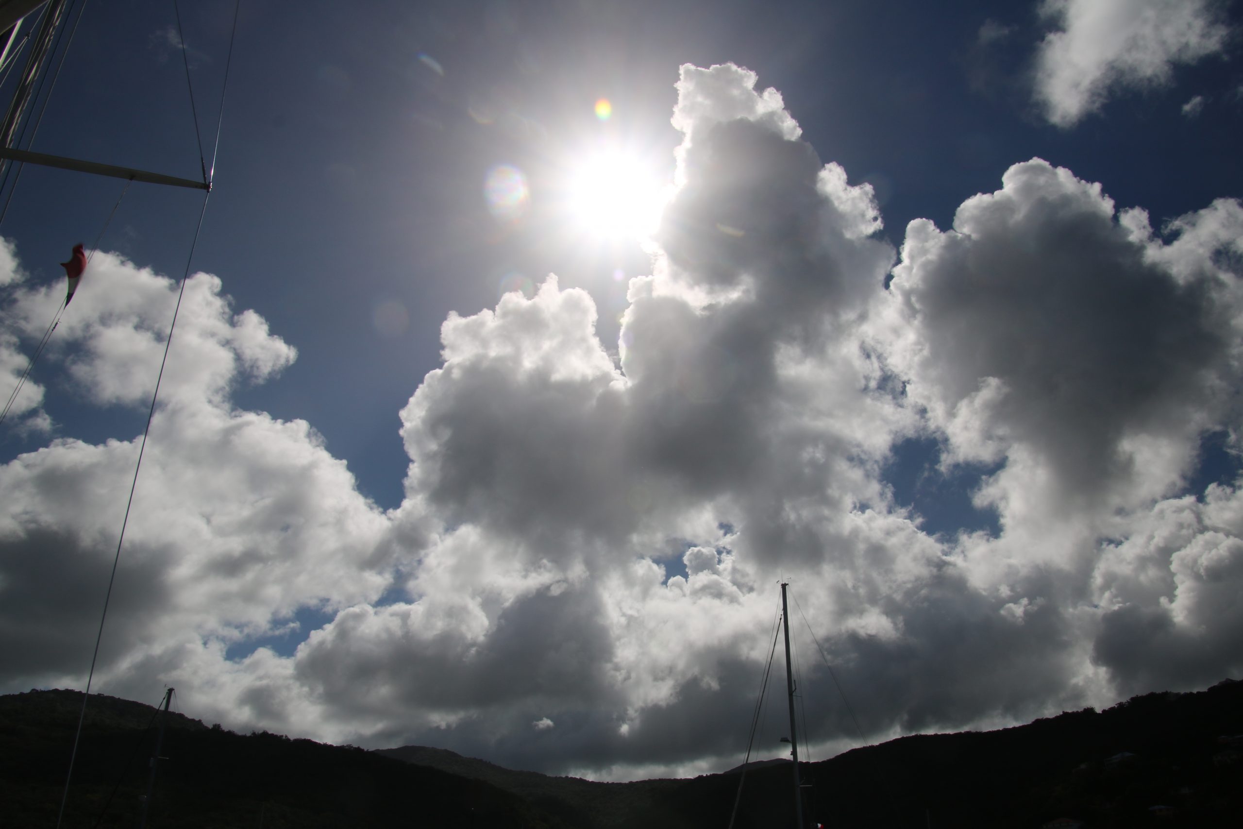 Some flowers don’t look anything like flowers.And a view of Pandora in the harbor far below. And what post is complete without clouds?That look, upon closer inspection, like a baby duck reclining on the cloud bank.  Get it, his head with feet to the left?  Well, that’s what it looks like to me.  Not buying it?  Work with me on this. Ok, anyway, I love clouds so perhaps yet another.  Pretty dramatic day here in Deshaies, Guadeloupe.
