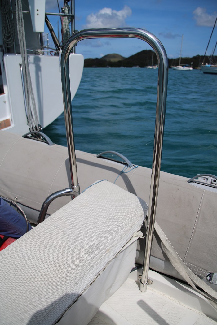 Last week we were climbing, not all that gracefully, out onto yet another dock and as Brenda got up onto her feet, a woman nearby said, “you should get one of these for your dink” pointing to a bar that has been installed on theirs.   Her husband, who had a bad stroke a while back, needed a way to steady himself in the dink so they had a bar installed to help him get in and out.  She then pointed to a nearby shop, Inoxalu.  The business is owned by a very nice German couple.  The husband Kai, is soft spoken and extremely precise in his work.  It was clear that he thinks hard to make sure that form follows function.  He took time with Brenda in the dink to make measurements so it was the right height to help her and also to find a way to secure the structure to the dink without needing to drill any holes through the hull.