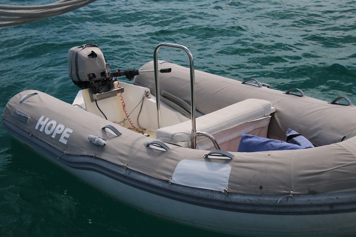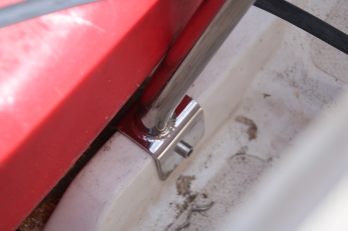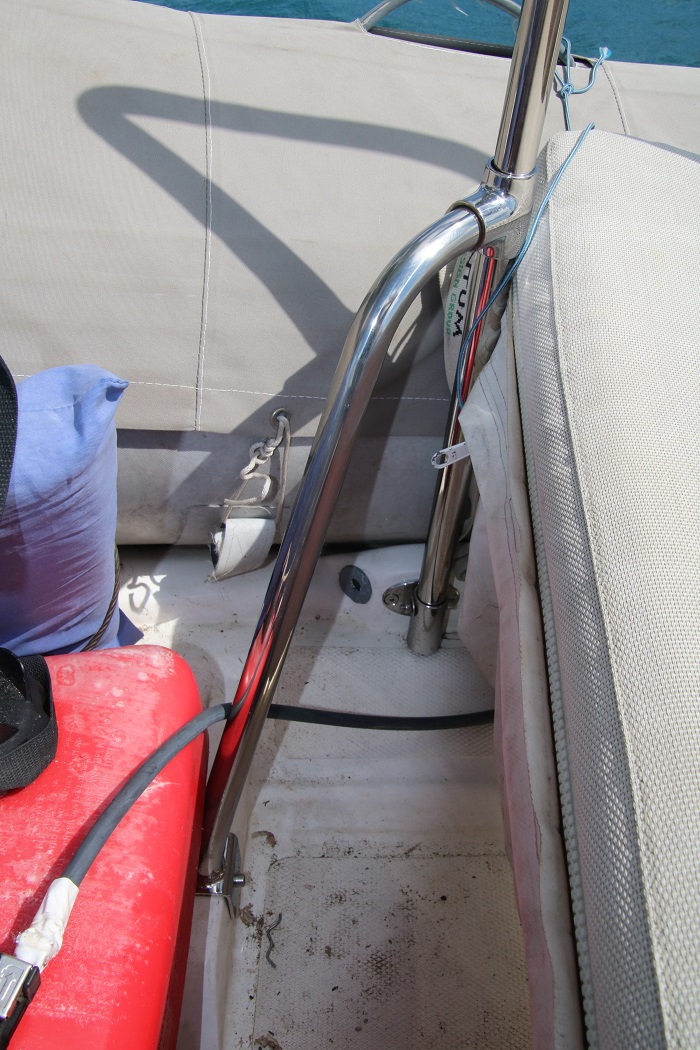 We had the bar installed on the starboard side of the dink as that’s the side that we always pull up to our transom when entering the dink from Pandora. It straddles the seat so it’s a good backrest to help Brenda feel more secure when we are blasting along over the choppy water in the harbor. As we did not want him to bolt the bar directly through the bottom of the boat so  he fabricated some very nice fittings for the pipe to go into.   This is the aft fitting and the pipe can easily be unbolted and removed. The forward outboard fitting is also bolted into a ridge running down the bottom of the dink.And there is a third leg that bolts onto a ridge aft of the forward fuel tank to give the whole structure rigidity.  The bar is very sold and does not wiggle at all.   It works exactly as advertised and Brenda is already finding that it makes getting in and out of the dink much easier.