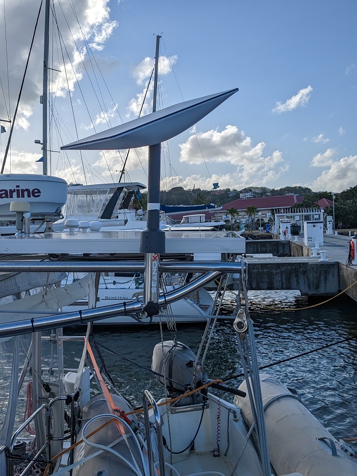 As you may recall, that installation exercise nearly cost me a few fingers when I forgot to turn off the wind generator and it clipped my hand. Nasty and really bl0ody. I still have ‘t been able to get the blood out of the bimini canvas or the chaps on the dink that were spattered.