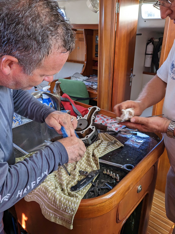 So, back to the marina and a frantic look for a tech to solve the problem. Why I didn’t think to find someone to put in the seals that I had purchased a few days ago is a mystery to me but I did find someone near the marina to come aboard and take off the water pump yesterday afternoon.