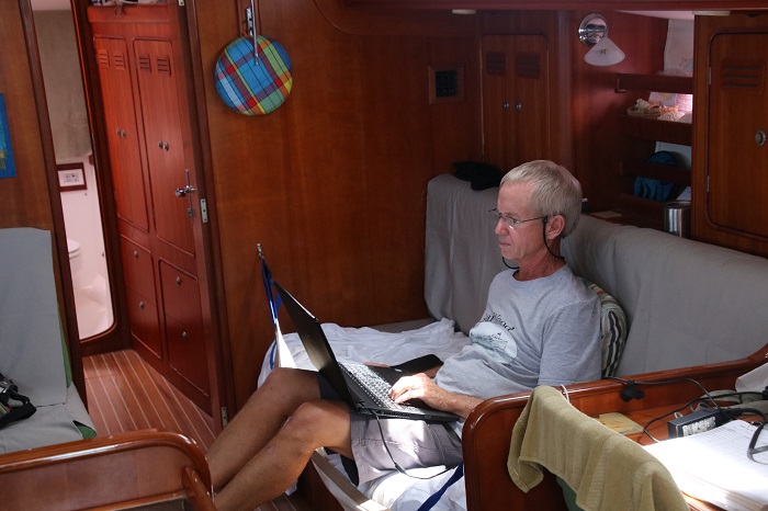 So, here I sit, typing away in my “office”. I spend a lot of time sitting here as the cockpit can get crowded with the guys reading and keeping watch.