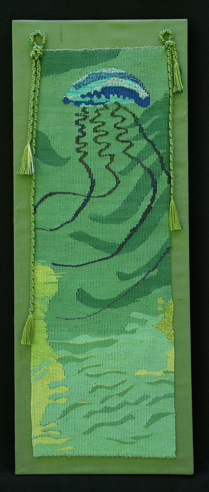 As pretty as they are, don’t be fooled, as to touch one of the tentacles that trail along upwards of 10’ below, pack quite a punch.Brenda and I have seen many of these as we sailed along the US east coast, particularly off Florida when we were spending our winters in the Bahamas.  There was a time when we were in Boca Raton and several were blown thru the inlet and into the harbor.   Brenda was inspired to do a tapestry that she titled “blown off course”.I think that this piece is one of her best and others seem to agree as she has received several awards at shows and the piece was featured in a national fiber arts magazine last year.   It is worth noting that the “braids” affixed to the borders are a Japanese technique that she does.  These intricate silk braids are hard to do but she has had a lot of practice.
