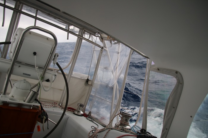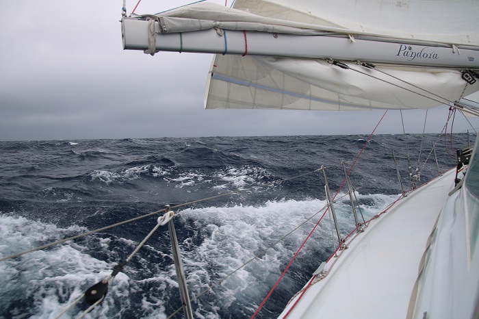 With all that wind we spent hours going at double digit speeds and more than once were going upwards of 14kts through the water.    Earlier in the run we had also encountered winds topping 40kts and had been reduced to a third reef and a nearly fully furled jib.