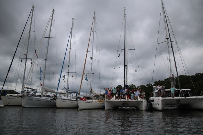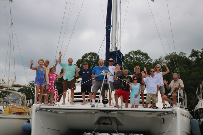 The next day a number of boats headed up to Hamburg Cove for a raftup. Most cruisers never raft, or tie up together, as most harbors are just not settled enough so this was a novel experience. When we were young and new to boating, Brenda and I rafted with friends nearly every weekend. Because of the great width of the two cats, the raft was nearly 100′ from end to end and required two moorings to hold the group.