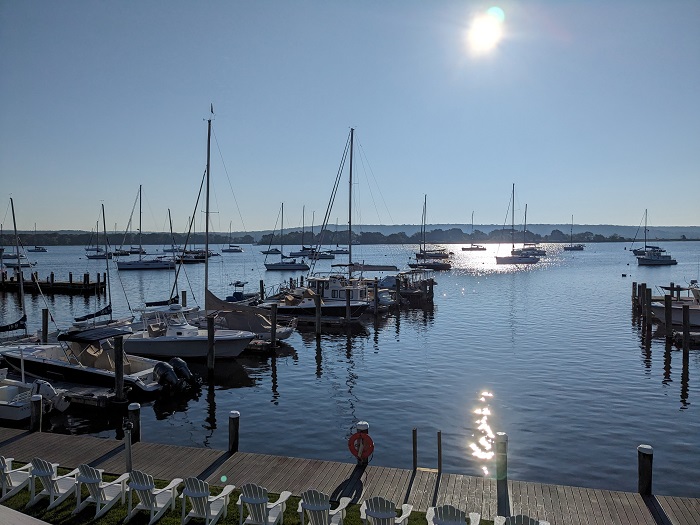 We spent Thursday night on the EYC dock so I could get provisions aboard and clean her up before heading out. The morning was clear and dry, a big change from the humidity and heat of late. That’s Pandora on the face dock to the left, the one with the double headstay.