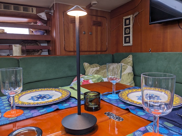 And, these nifty rechargeable lights that Brenda got for me. They can be made to dim and change color. I use them down below on passage for soft red night lighting in the galley. We also hang them in the cockpit when we head ashore so it’s easier to see in the cockpit when we return later. And, of course, rechargeable bluetooth speakers. We use these to listen to music and also to extend the sound from our laptop if we watch movies in the cockpit.