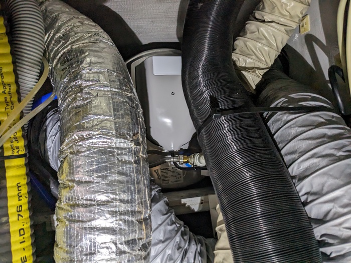 I had to move a huge amount of stuff to make room for it. Here’s the finished install. “Water heater? I don’t see no stinkin waterheater. ” Trust me, it’s somewhere back there.