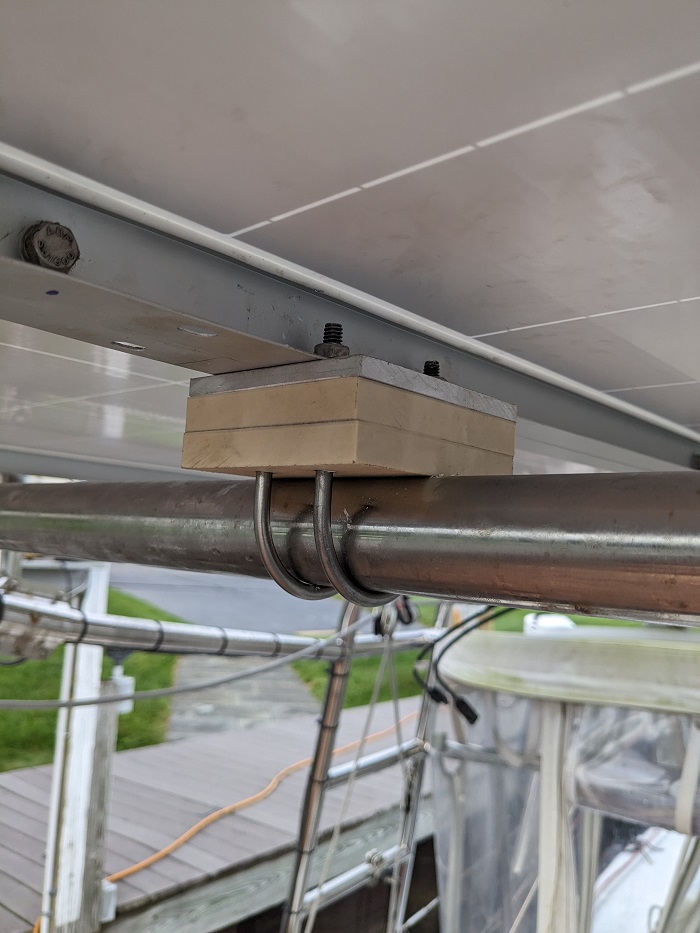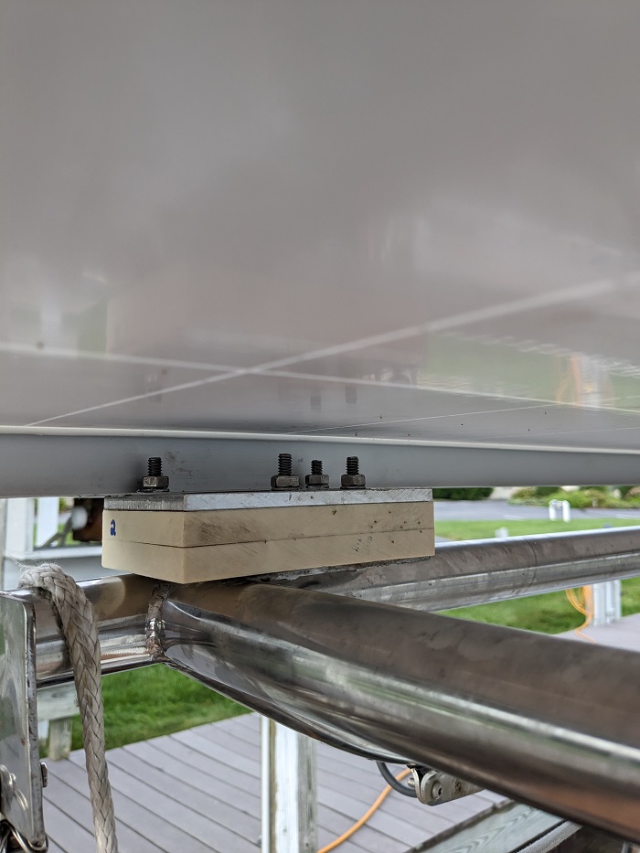 In order to be sure that the three new panels are well secured to the davits, I had to fabricate a half dozen custom brackets made up of starboard and 1/4″ marine grade aluminum. They were a lot more complex than they look to get in place with properly drilled holes. This version on four corners.