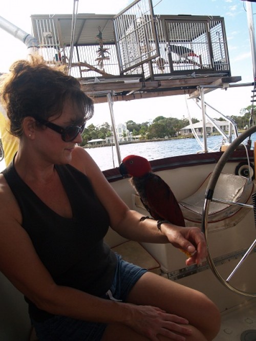 So, how do parrots take to sailing? I learned that Dante does fine but that Lucie suffers from the male de mare and throws up when the going gets rough. I guess that makes sense, but it seemed pretty funny to me. The idea of bird puke doesn’t seem that funny but hey, it’s funny in a “potty humor” sort of way. Trish told me that Lucie does a bit better in the puking department when she sits on the dining table, yes the dining table, on her perch under way and that as the boat sways to the waves, Lucie sways back and forth on her perch staying perfectly still. Yea, if I were a parrott I’d blow lunch doing that. Oh, another funny thing is that Lucie, since enduring a traumatic hurricane season in 2004, plucks out her breast feathers so she is in a prepetual state of scruffiness. “OK, OK, I’ll go with you on that ^%$# boat but I am going to pull out all of my feathers if you insist”. It’s sort of like picking your nails but looks a lot worse.
