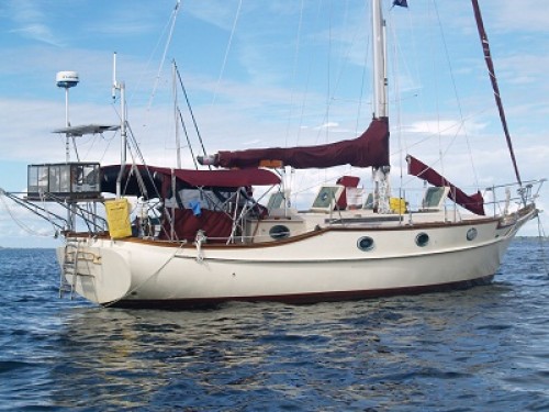 There are quite a few boats anchored near us here for the GAM and it’s fun to see what sort of craft show up. I was particularly interested in this boat and the funny boxes “perched” on top of the davits on the stern. This spot on cruising boats is often occupied by solar panels, an important addition to any boat. What ever it was, it must be important to take up such prime real estate They looked a lot like cages to me and I couldn’t imagine what could be inside them. Perhaps they enjoyed fresh poultry, I imagined, or that they were a member of some sort of satanic cult and needed to keep their sacrificial “offerings”on board. So, what’s a curious cruiser to do? How to solve the mystery? Well, of course, just go say HI, and I did.