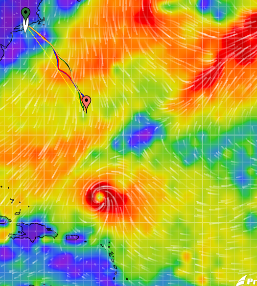 If you look forward to Saturday morning, when we are currently considering beginning the run, there is very little wind suggesting that we will be motoring much of 650 miles to Bermuda. However, at that time Tammy will be right over Bermuda. Not good to be heading south when she is moving north.