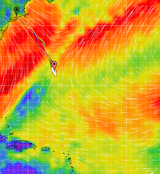 The current forecast suggests that we must arrive in Bermuda by late on Tuesday in order to get ahead of some very strong northerly winds. These winds are expected to fill in on Wednesday but of course that is a week out so the forecast could very well change but right now it looks like “threading the needle”.