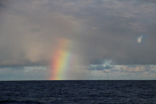 Shortly after dawn, a shower passed and left behind a lovely rainbow. You really get a feel for just how expansive the ocean is with this photo, rainbow, clouds, and a tiny spec of a sail, if you look closely, on the horizon.