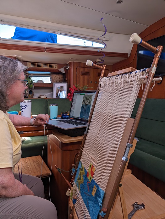 I have tried to do what I can to help Brenda feel productive aboard Pandora this winter. It is no secret that she misses “her people” when she is here in the tropics. To ease all that, this winter she is doing a bit of teaching for some of her more advanced tapestry students. Here she is during her first two hour session. We have things set up with a second camera so that she can demonstrate techniques as well as share photos from her computer along with commentary. It seems to be working very well and she’s enjoying the time .