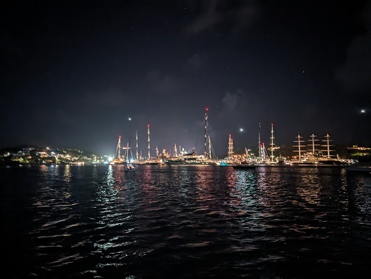 Nighttime is beautiful in Falmouth with all the yachts brightly lit. I can only imagine with that costs as a KWH is about $.75. I have been told that some of the yachts run up electric bills of thousands a week. I guess if you have to ask, you can’t afford it.